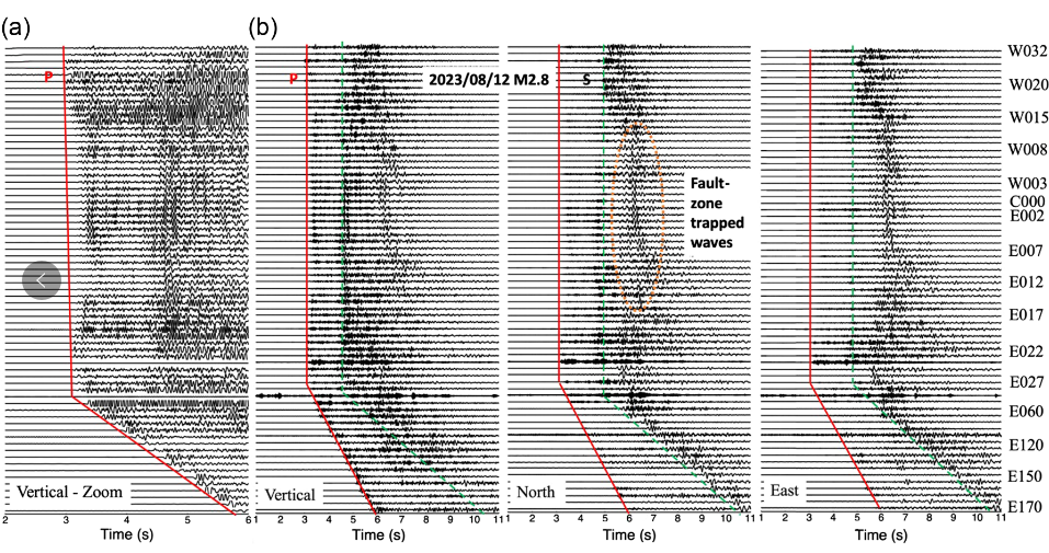 通过在密集线性阵列中记录到的Mw2.8地震的波形,研究团队观察到了明显的断层带波。这些波形表明,P波的到达时间存在延迟,并且可能出现了断层带的陷波现象。这一发现为进一步研究地震波在不同断层带中的传播特征提供了宝贵的实验数据。